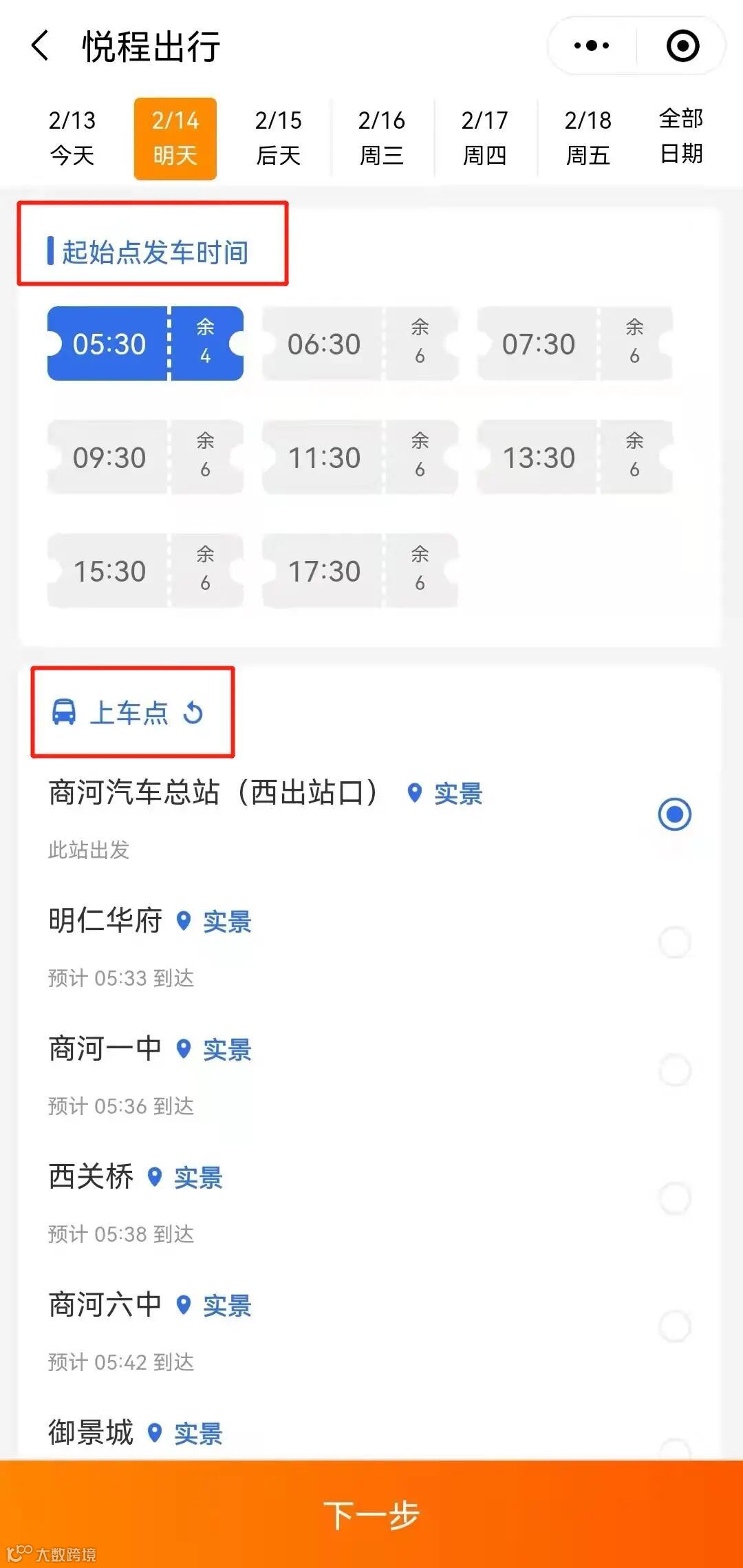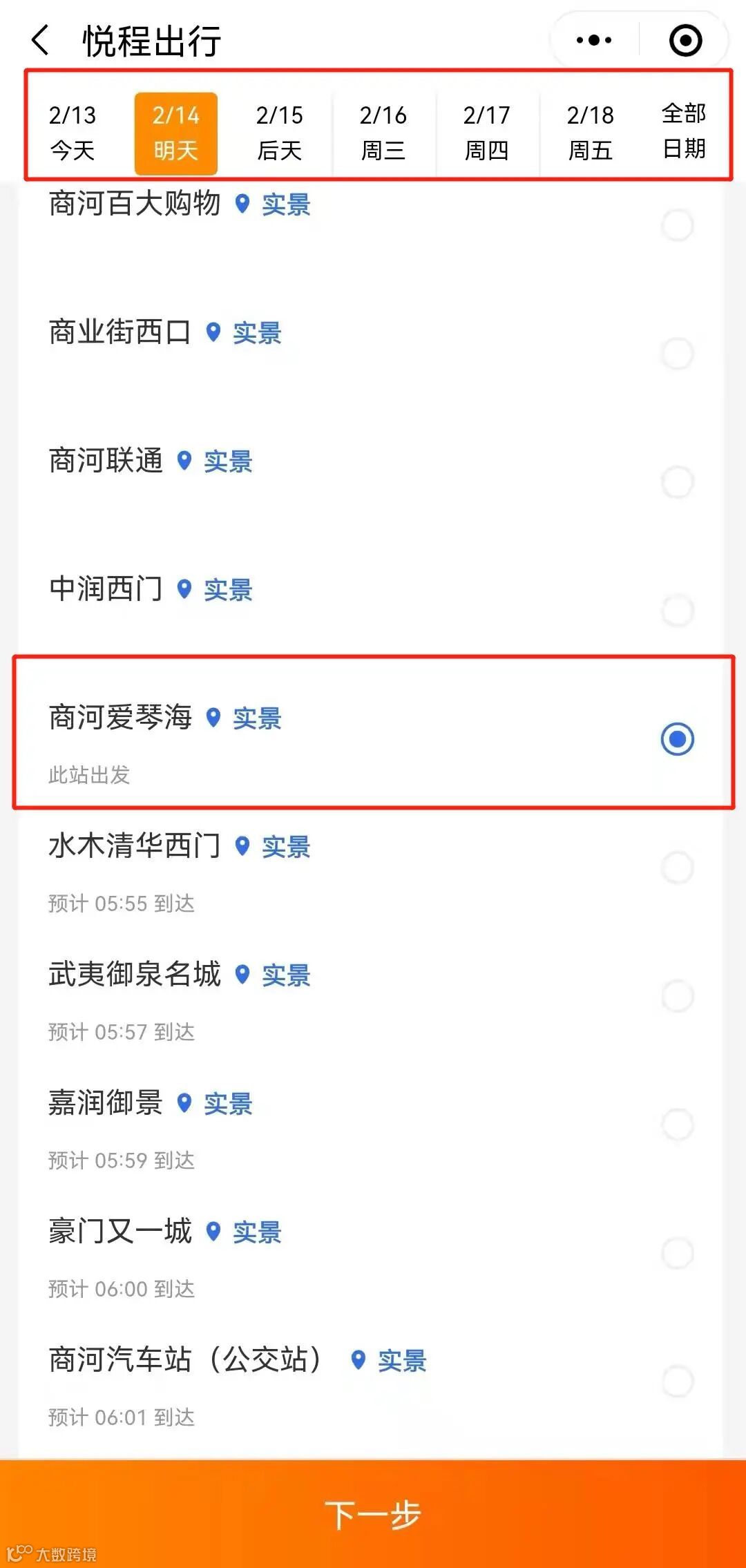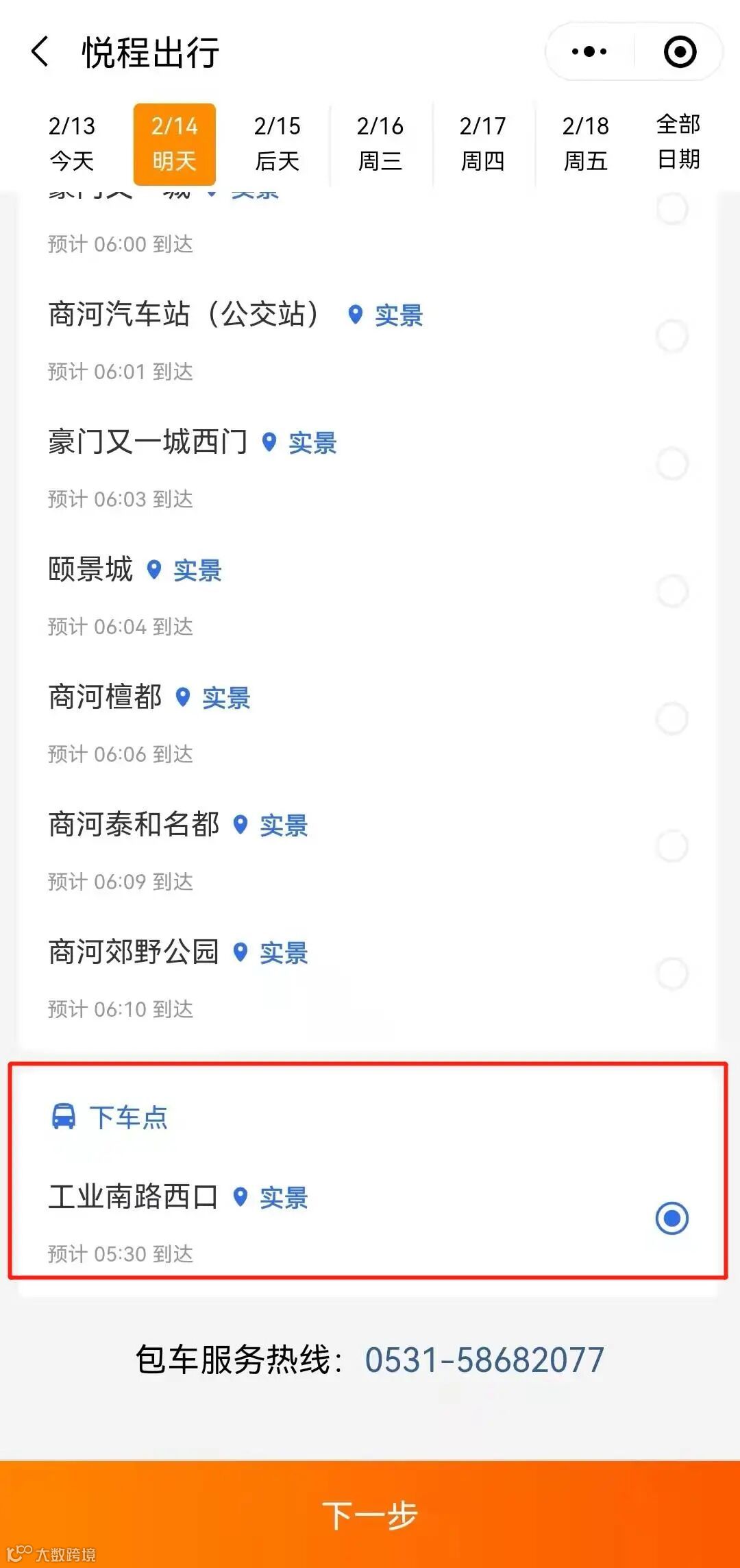 5.选择好上车点后,下滑选择下车点,下车点系统仅显示终点站,您可以上车后告知司机自己具体的下车点,以下站点均可选择: