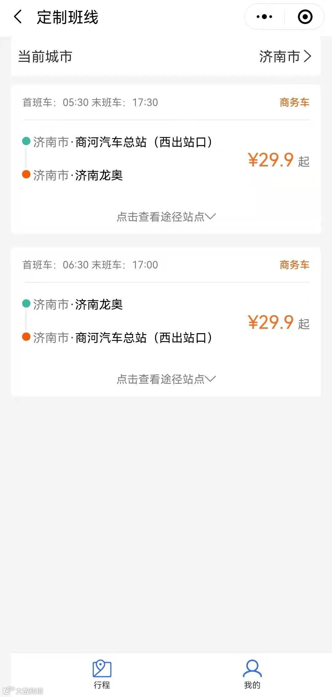 2.如下图所示,您可以看到有两条相反线路,前者为商河发往龙奥,后者为龙奥返回商河,在此以商河→龙奥为例,“点击查看途经站点”可查看站点,点击站点可进入站点选择;