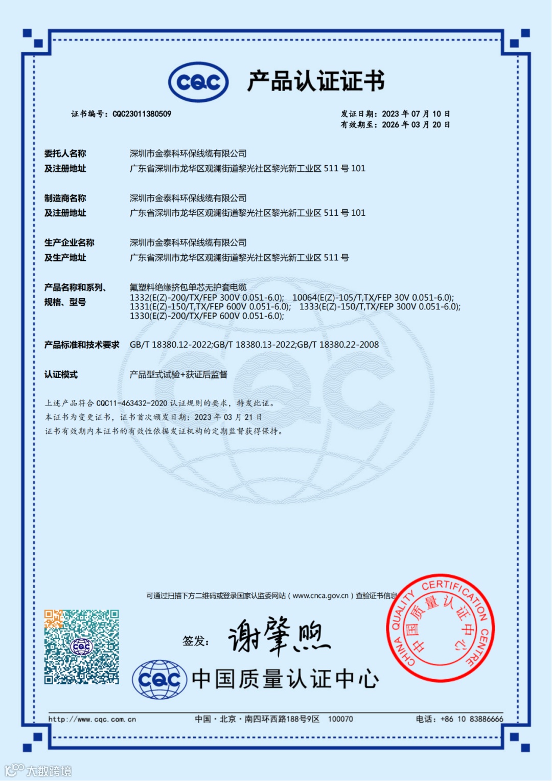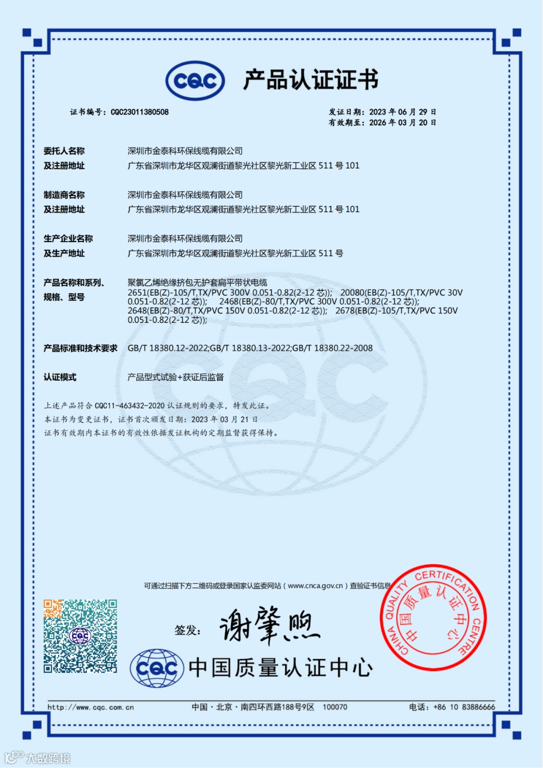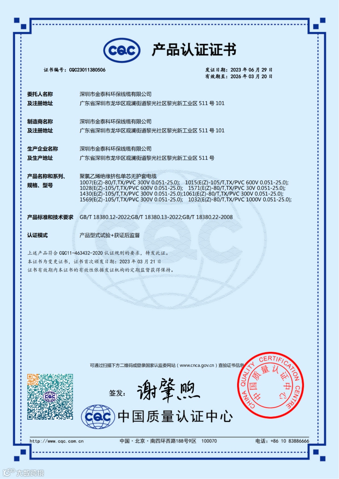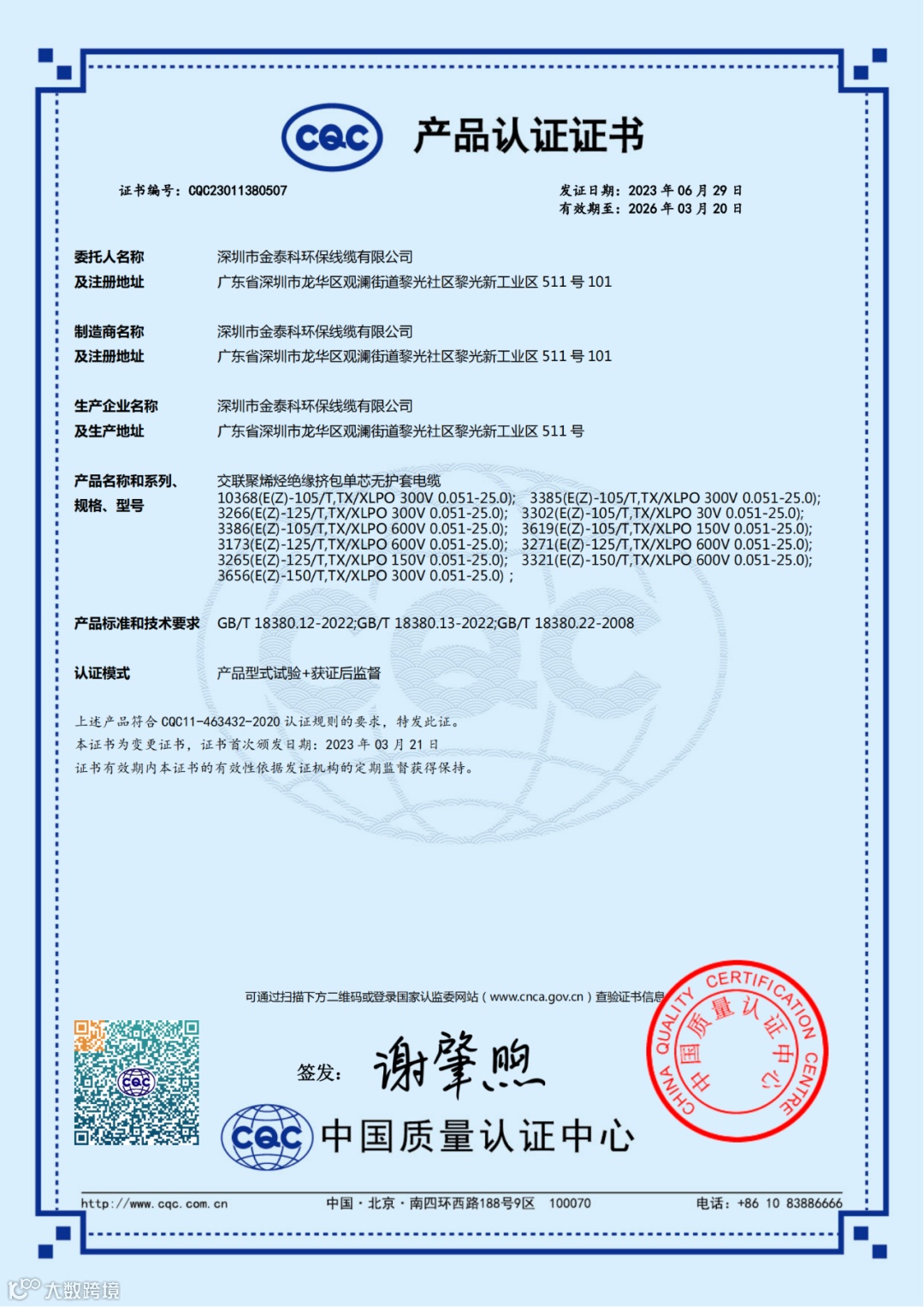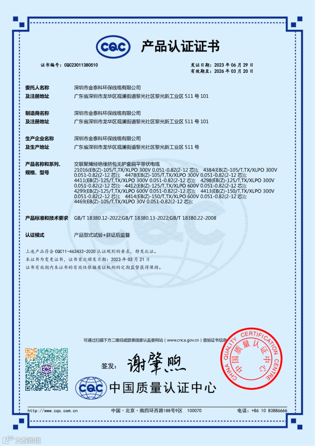 您有一个新的消息:金泰科CQC产品型号增加!