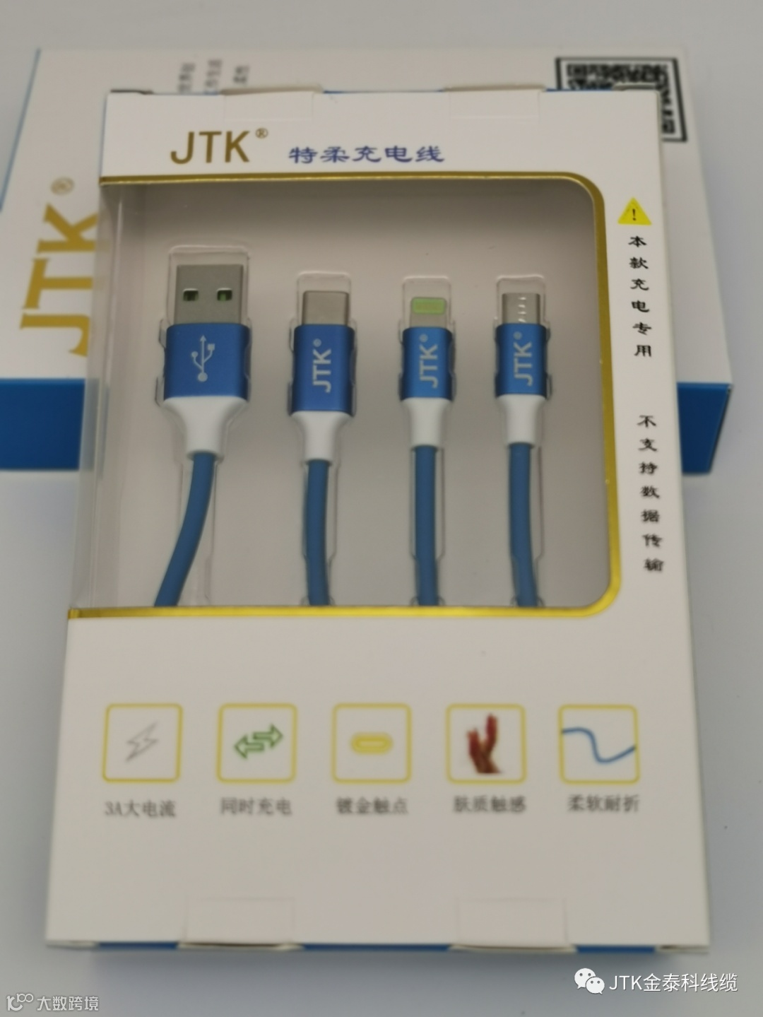 2.每月下单客户,同时手机微信有关注“金泰科线缆”公众号,且使用移动ERP下单,可免费获得一条由JTK特殊订制的一拖三USB充电线,礼品图片如下,送完即止。