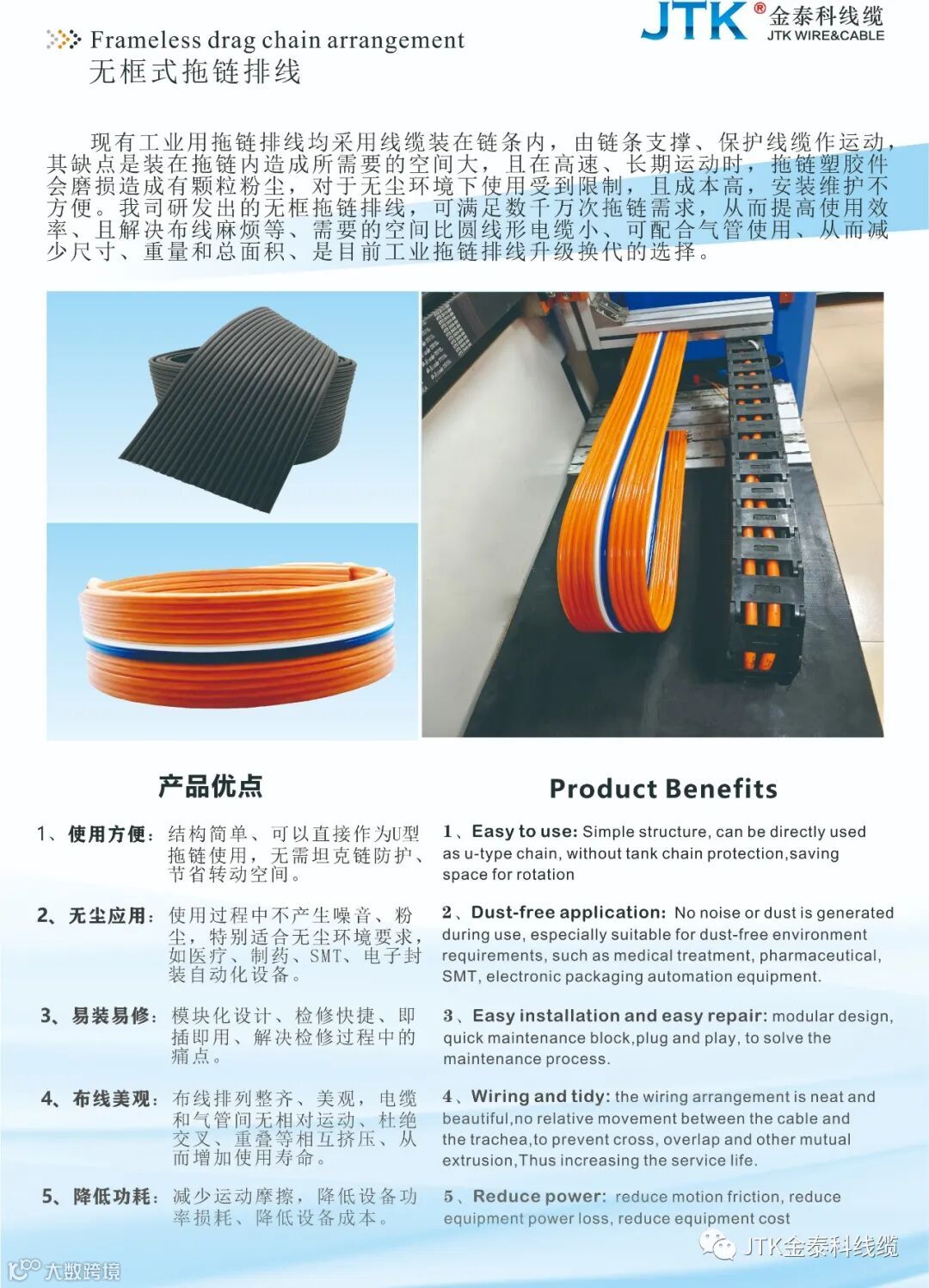 JTK金泰科线缆经过三年多反复的研发试验,我司率先在行业内推出了机器人无框拖链排线,这款产品的优点主要体现在使用方便、易装易修、布线美观、降低功耗、无尘应用。我们可以根据您的需要随心定制,欢迎有相关产品需求的各位尊敬的客户与我们联系,我们将竭诚为您们服务!