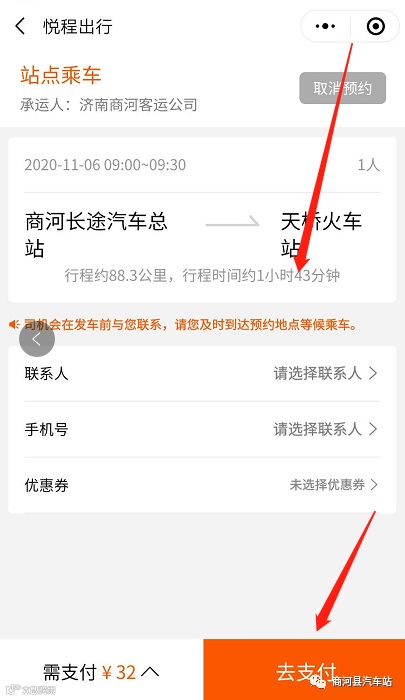 网上购票:关注“商河县汽车站”&“商河长途汽车总站”&“山商交运”微信公众号,使用下方菜单“定制服务”-“定制约车”,进入“悦程出行”小程序,点击“定制商务”即可进行购票。