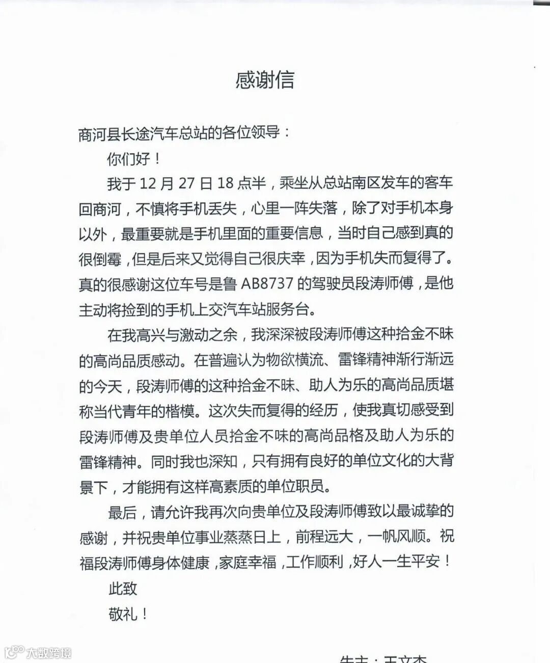 【暖心长途】感谢信:传递拾金不昧正能量