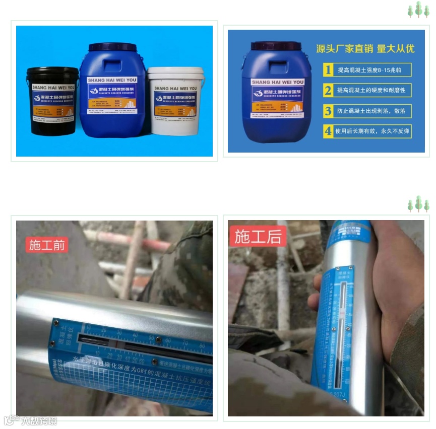 混凝土增强剂是一种无色透明液体材、无毒无味绿色环保、使用方便、不燃。通过有效的渗透,与混凝土中的化合物成分发生化学反应,使混凝土硬度快速提高,有效提高混凝土硬度、密度、抗压强度,回弹强度可提高: