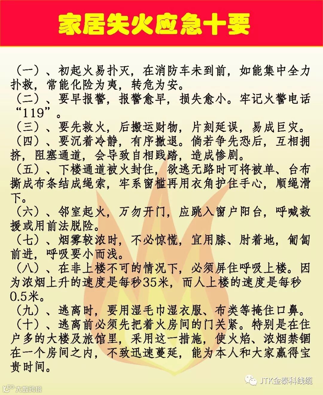 家庭防火很重要,夏季安全是使用电器更是要放在心上的,一旦失火,你应该要了解的失火应急十要就能派上用场:
