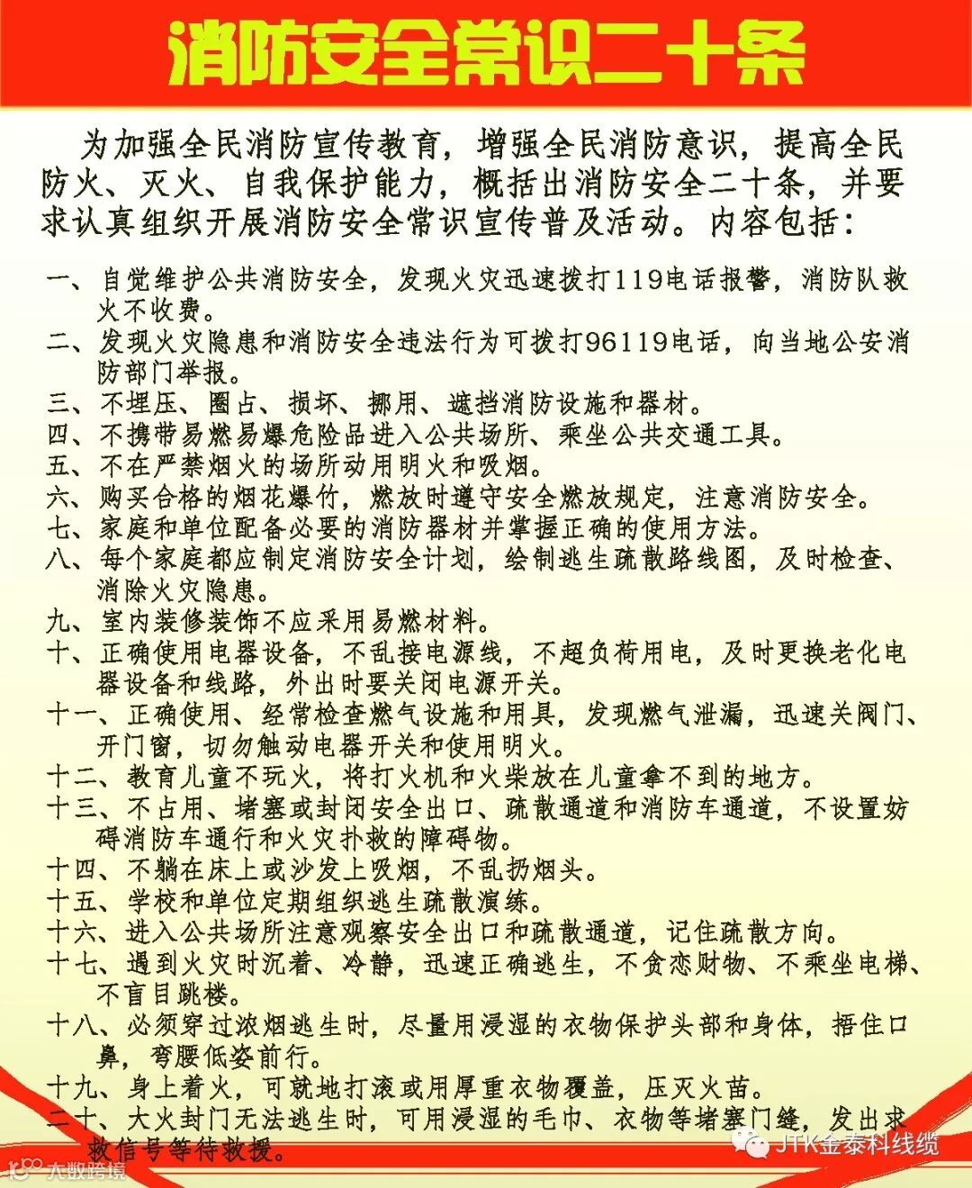 消防安全常识二十条,平时看看积累一些消防安全知识,做到预防为主,遇到紧急时刻也能及时的自救和他救。