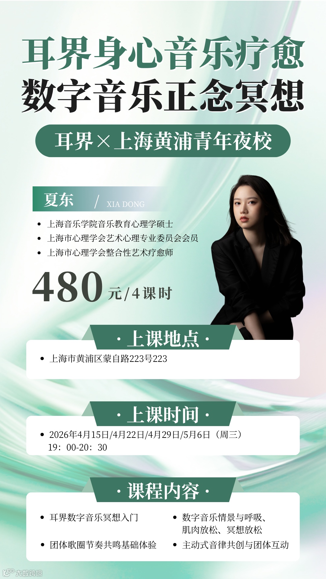 好消息来啦!耳界身心音乐疗愈课正式加入上海青年夜校!本次课程特别感谢共青团上海市委主办的青年夜校平台,以及演艺大世界的大力支持。课程将落地上海市打浦桥街道党群服务中心,为上海的青年朋友们带来一场沉浸式的身心疗愈之旅。