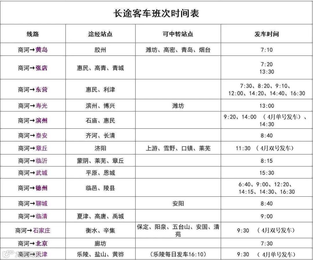 4月长途客车时间表,快来收藏吧!请持续关注微信公众号【山商交运】&【商河县汽车站】,以最新通知为准。如有疑问,欢迎拨打0531-84880035咨询。