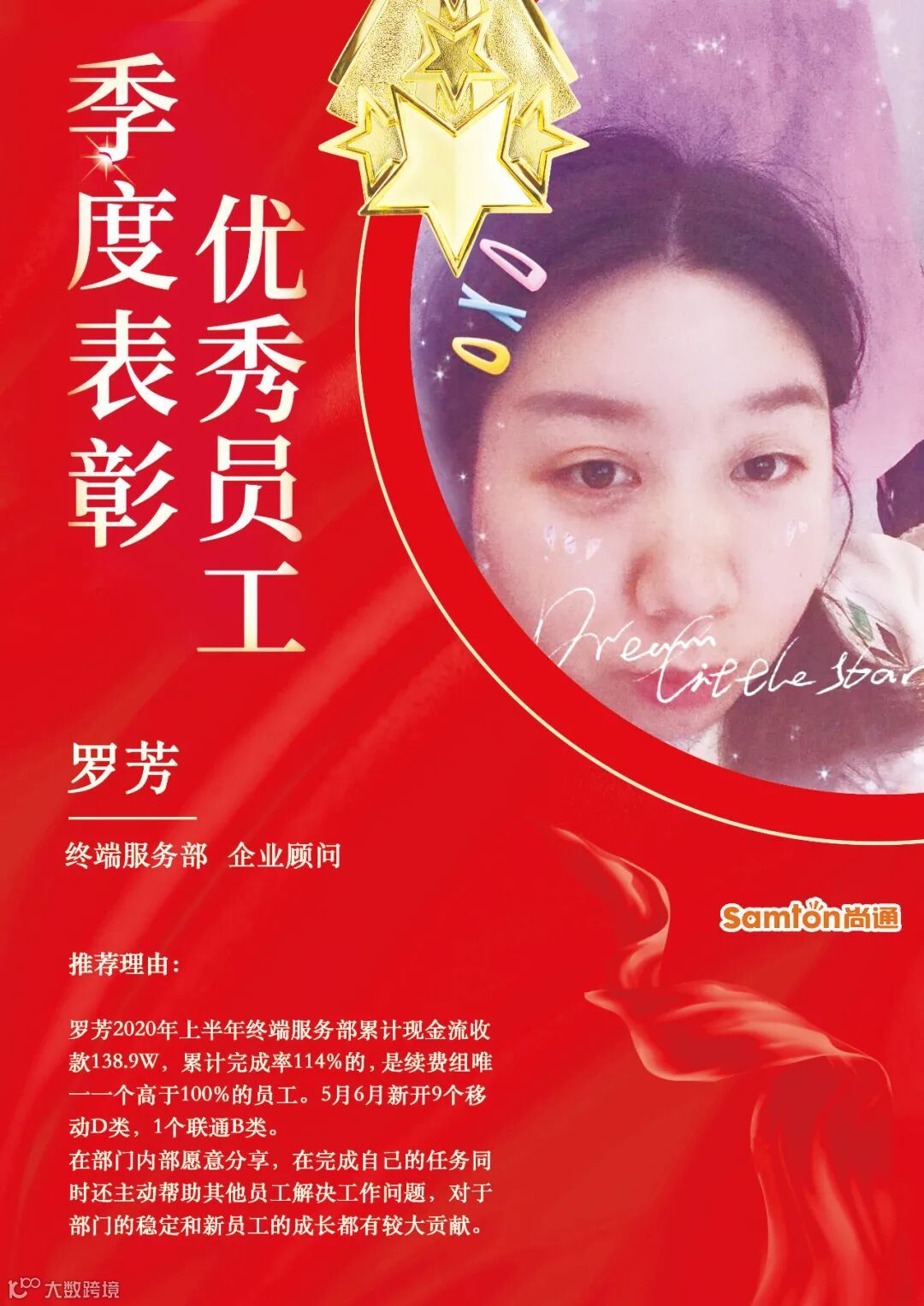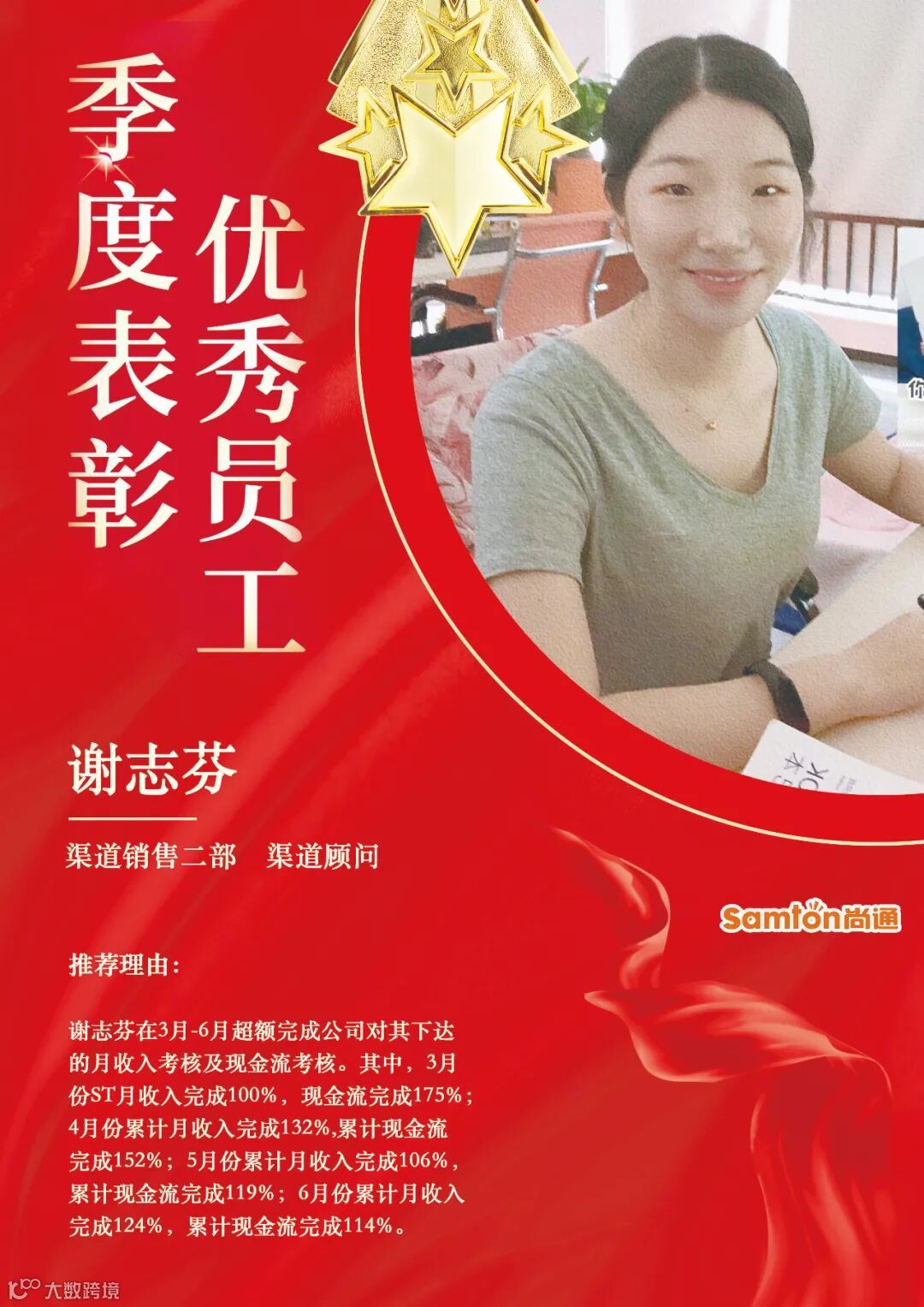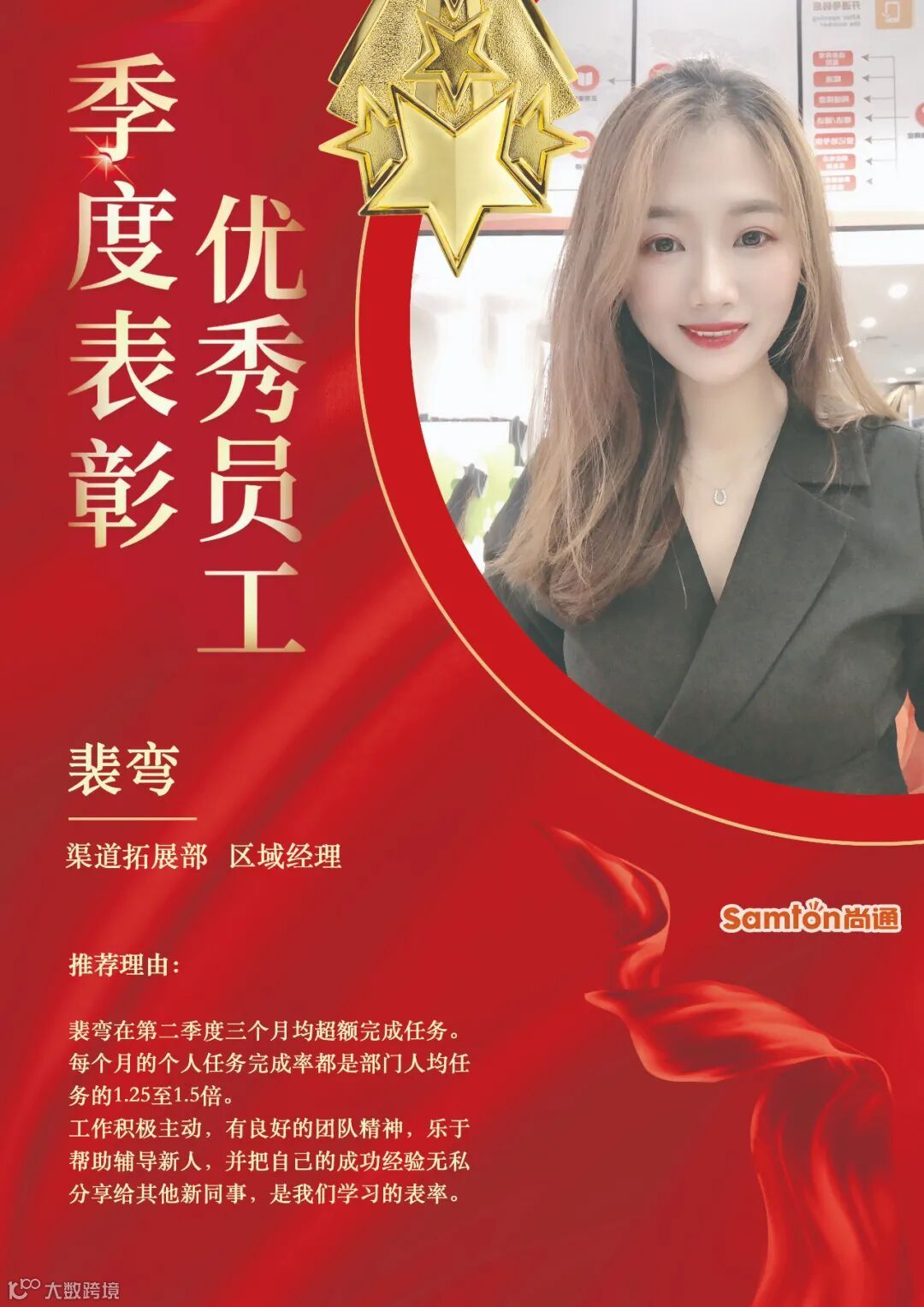 “优秀员工”是公司对员工最大的肯定,社会在不断进步,发展,我们要与时俱进不断为自己充电,才能跟上社会的步伐,在尚通,优秀的他们就是公司财富,值得我们尊敬和学习,感谢他们的辛勤付出!