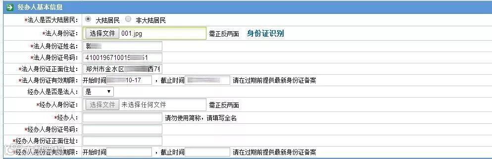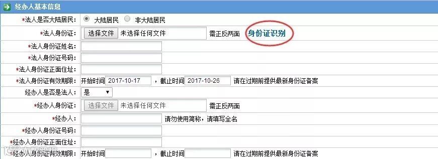 在填写法人身份证基本信息时,我们只需上传法人身份证的图片(需正反两面),点击“身份证识别”即可自动显示姓名,身份证号,住址等信息。如下图(点击图片即可看大图)