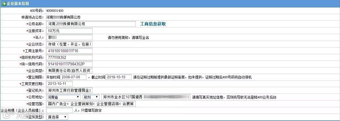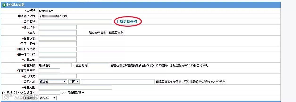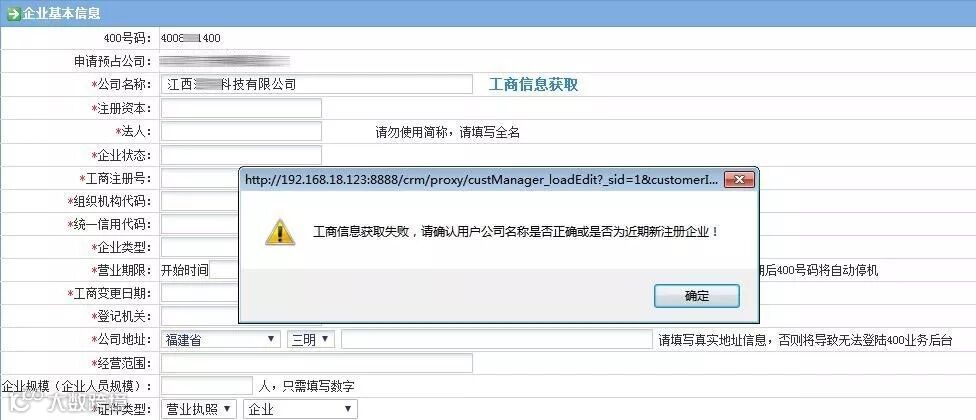 首先我们先找到预占的400号码,点击新增客户资料。在填写企业基本信息资料的界面,我们只需把公司名称填写完成,点击“工商信息获取”剩下的企业信息则会自动导入到文本框中。如下图(点击图片即可看大图)
