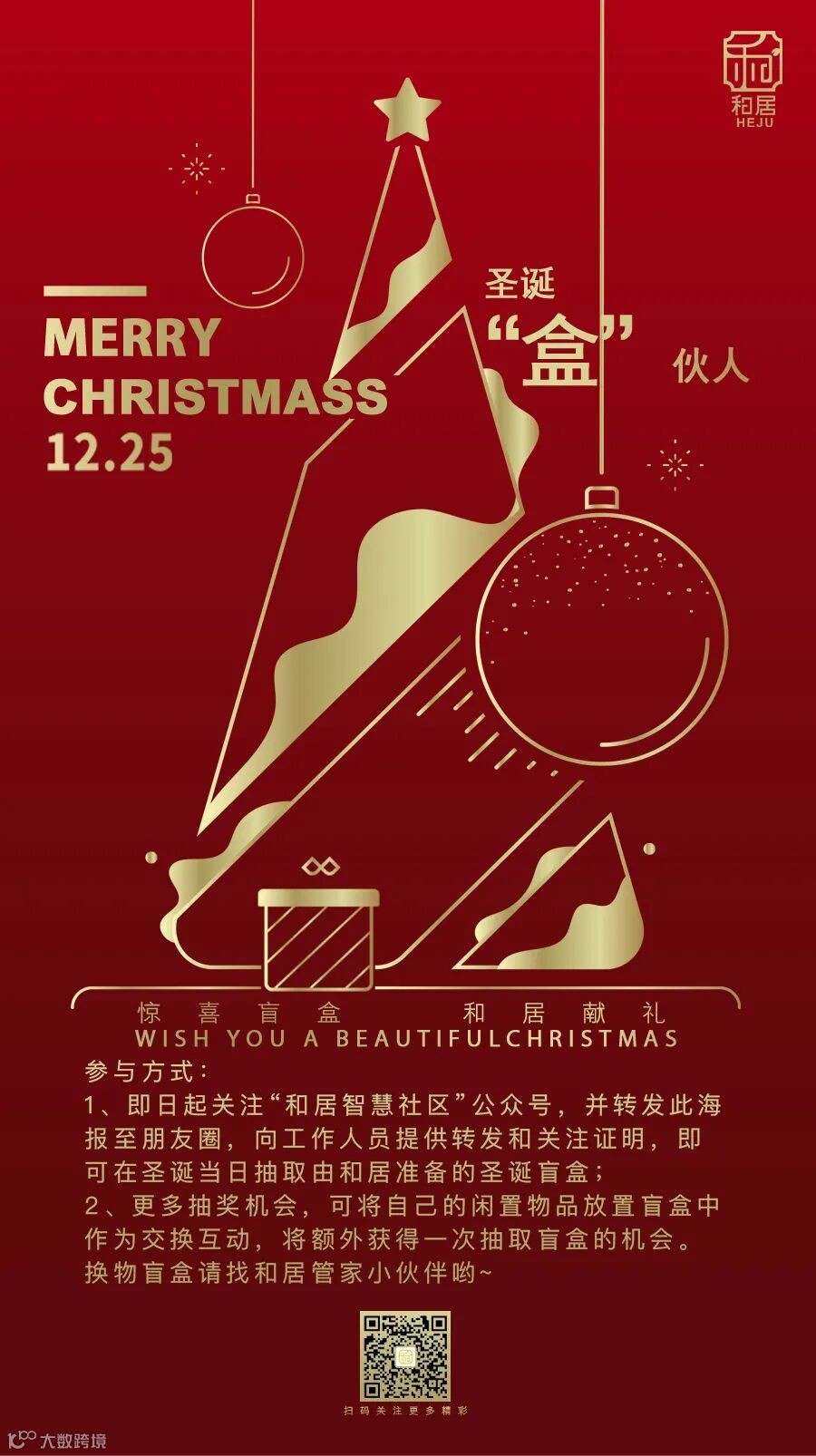 即日起关注“和居智慧社区”公众号,并转发圣诞海报至朋友圈,向工作人员提供转发和关注证明,即可在圣诞当日抽取由和居准备的圣诞盲盒;