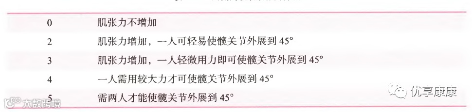 3.两侧内收肌肌张力分级(bilateral adductor tone rating)该分级是评定髋内收肌群的特异性量表,主要用于内收肌痉挛的患者治疗前后肌张力改变的评定。包括0〜4个等级。