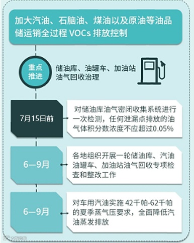 加大汽油、石脑油、煤油以及原油等油品储运销全过程VOCs排放控制,在保障安全的前提下,重点推进储油库、油罐车、加油站油气回收治理,加大油气排放监管力度,并要求企业建立日查、自检、年检和维保制度。