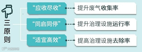 按照“应收尽收”的原则提升废气收集率。按照与生产设备“同启同停”的原则提升治理设施运行率。按照“适宜高效”的原则提高治理设施去除率,不得稀释排放。