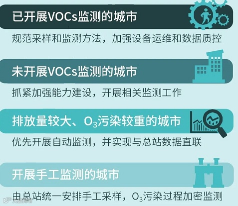 加快完善环境空气VOCs监测网。加强大气VOCs组分观测,完善光化学监测网建设,提高数据质量,建立数据共享机制。