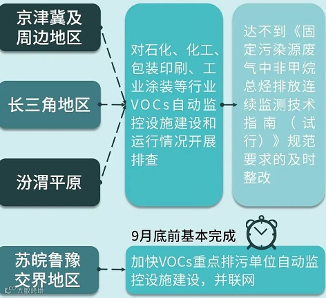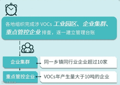 7月15日前,各城市根据本地产业结构特征、VOCs排放来源等,确定本地VOCs控制重点行业,组织完成涉VOCs工业园区、企业集群、重点管控企业排查,明确VOCs主要产生环节,逐一建立管理台账。