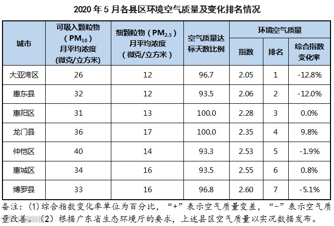 按照空气质量综合指数排名,各县区5月空气质量由好到差依次排名为大亚湾区、惠东县、惠阳区、龙门县、仲恺区、惠城区、博罗县。与2019年同期相比,惠阳区空气质量无变化,惠城区、龙门县空气质量有所下降,大亚湾区、惠东县、博罗县、仲恺区空气质量均有所改善。