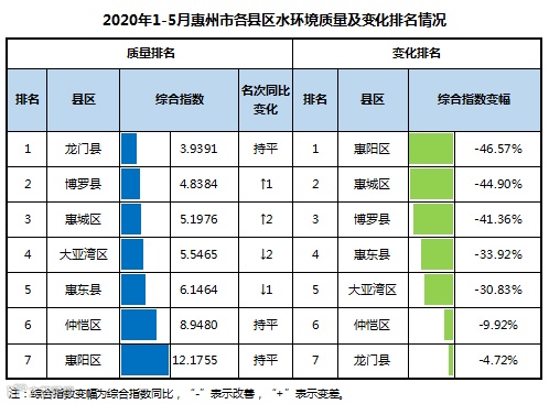 按照地表水环境质量考核断面综合指数排名,2020年1-5月,水环境质量由好到差依次排名为龙门县、博罗县、惠城区、大亚湾区、惠东县、仲恺区、惠阳区。与2019年同期相比,惠阳区、惠城区、博罗县、惠东县、大亚湾区、仲恺区、龙门县等7个县区水环境质量均有所改善。