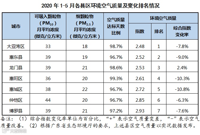 按照空气质量综合指数排名,各县区1-5月空气质量由好到差依次排名为大亚湾区、惠东县、龙门县、惠阳区、惠城区、仲恺区、博罗县。与2019年同期相比,除龙门县空气质量略有下降外,其余6个县区空气质量均有所改善。