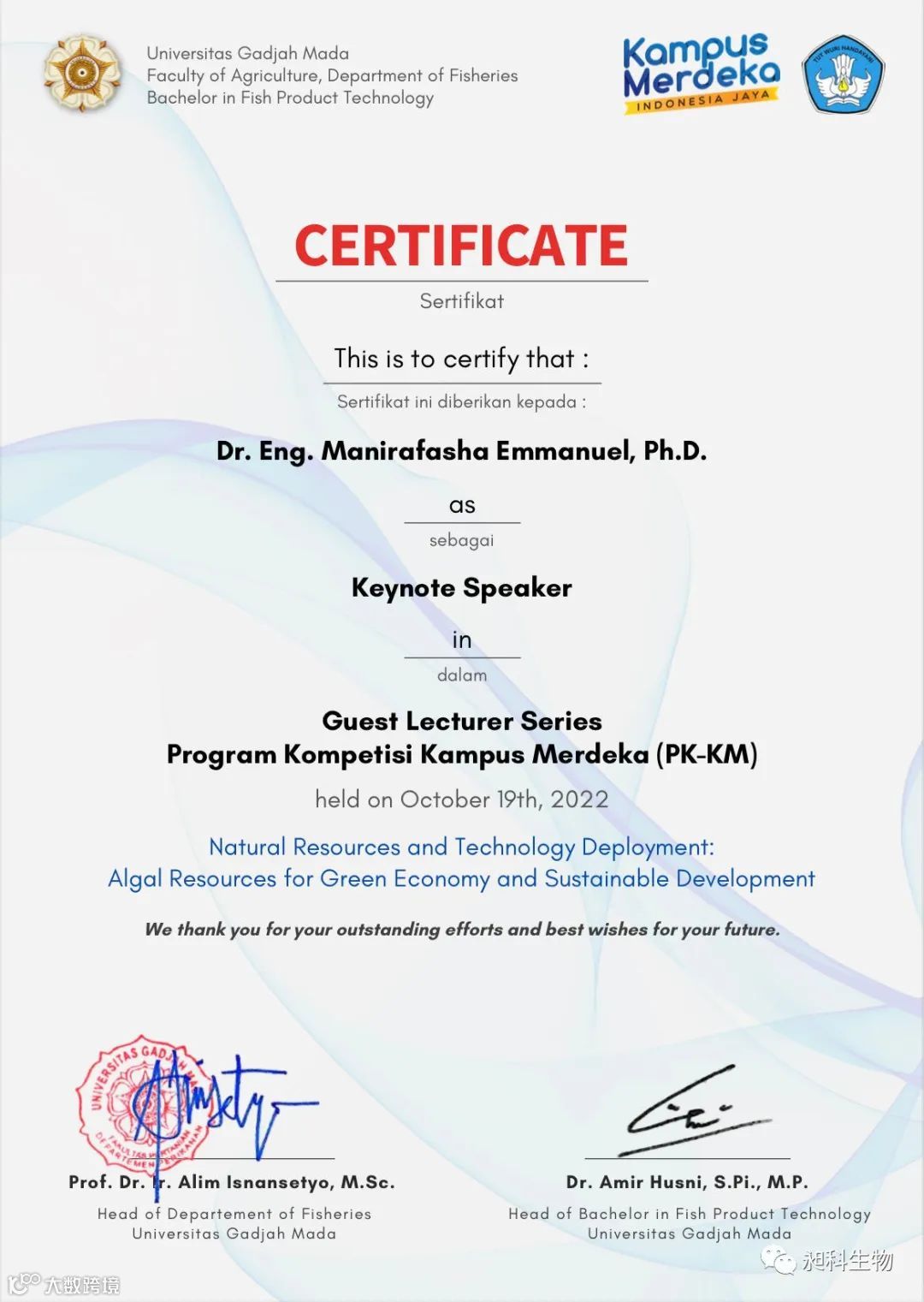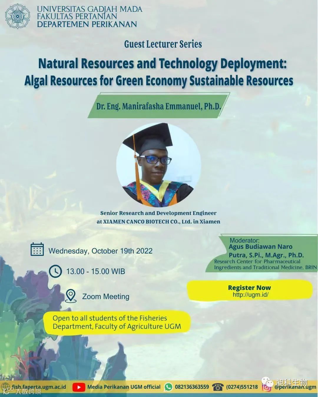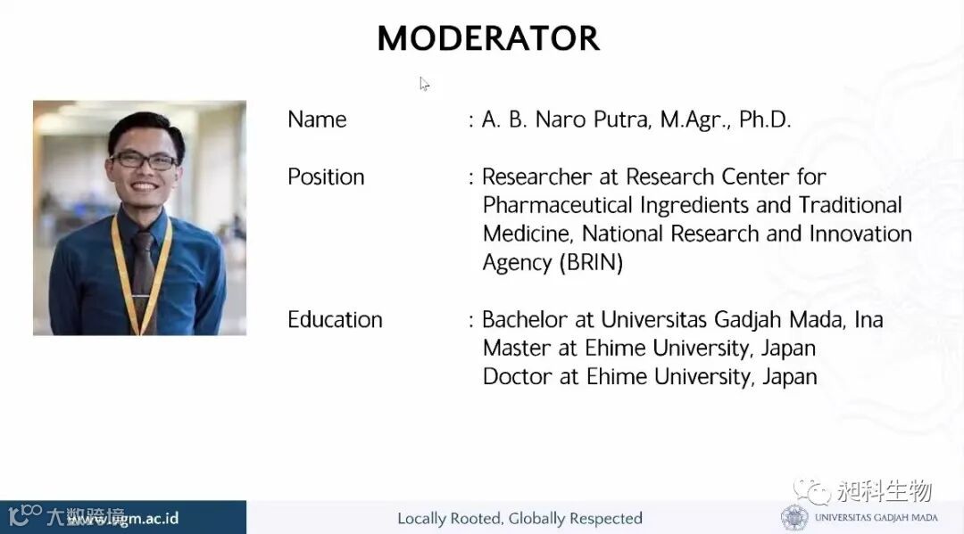 10月19日,厦门昶科生物工程有限公司的马博士在印度尼西亚Gadajah Mada加札马达大学,开展以在昶科期间研发“硅藻与螺旋藻的实际应用”为主题的在线讲座会议,会议全程由日本爱媛大学医学博士——Naro Putra主持,并邀请了Amir Ausni博士(鱼类产品技术学士教授)作为此次会议的嘉宾。马博士作为本次讲座的主讲人,观点鲜明,专业性强,引起了全体师生积极的专业讨论。