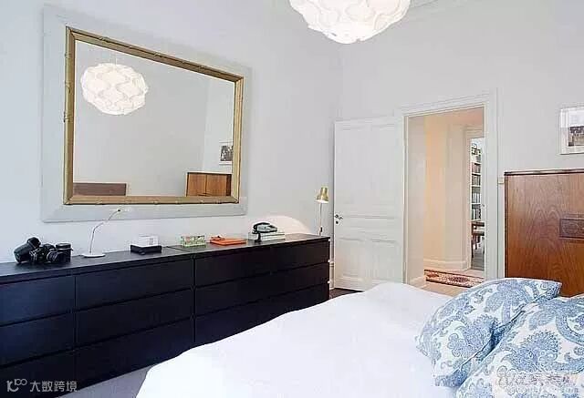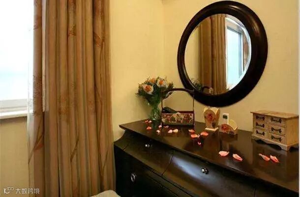 如果卧室内有梳妆台,必需要放镜子,解决方法之一,可用一面座台镜去代替,照的时候从抽屉拿出来,照完后放回抽屉内。另一方法是装镜后,在镜子前面加一块帘,需要时拉开,不需要时拉上。