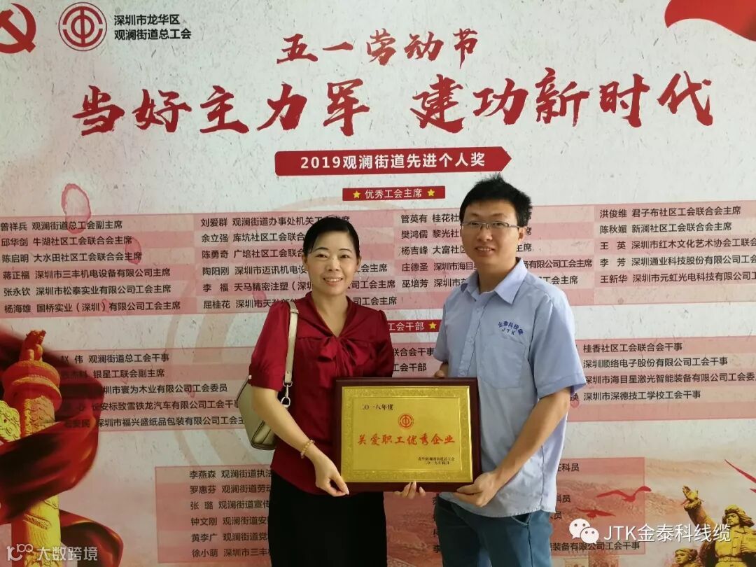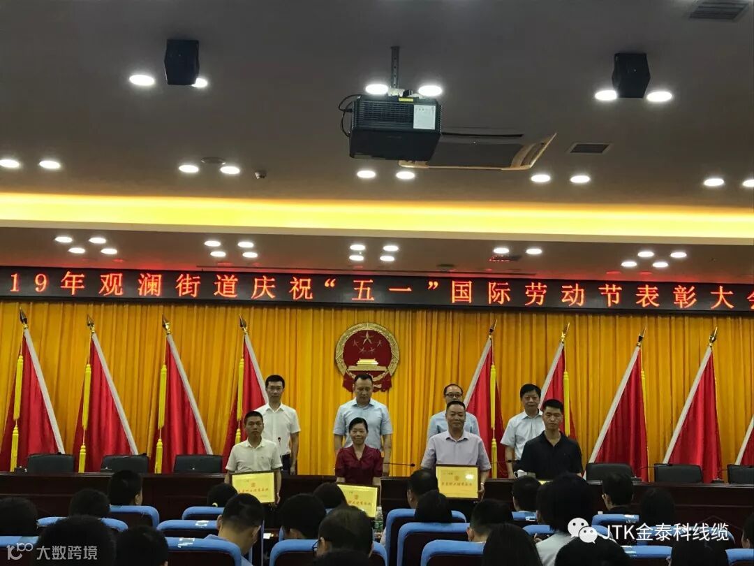 并对以上先进集体和先进个人进行颁奖。深圳市金泰科环保线缆有限公司被评为“关爱职工优秀企业”,公司工会主席陈倩上台领奖并与领导合影留念,感谢区工会领导及街道领导对我司工会工作的鼓励与肯定。在此,也祝所有辛勤劳动的人民“五一“节日快乐!