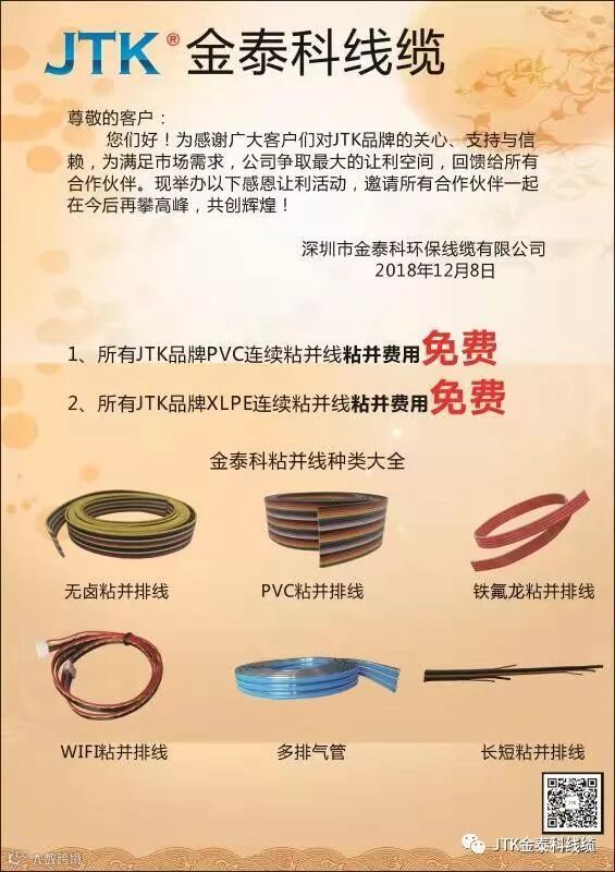金泰科线缆新年感恩回馈:JTK品牌粘并排线,粘并免费!