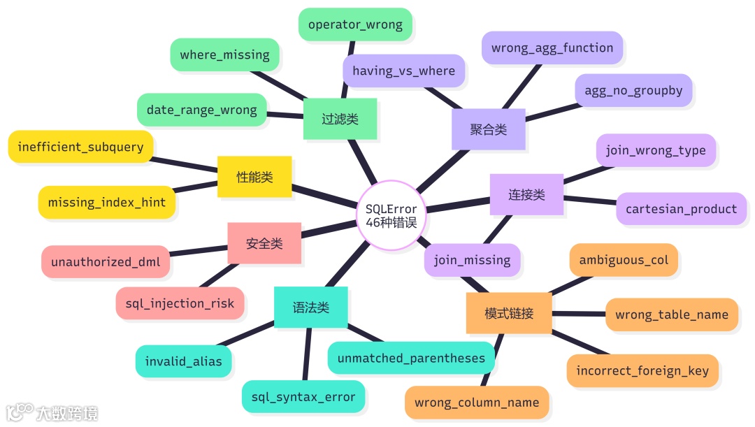 这是本系统与开源 NL2SQL 方案最显著的差异 —— 11 大类 46 种错误分类体系: