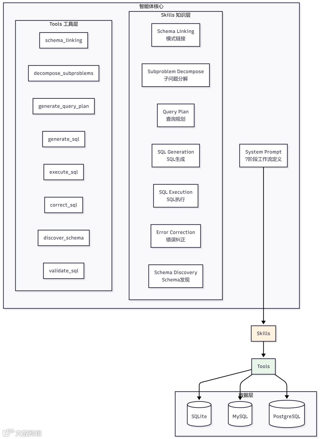 基于 DeepAgent + Skills + Tools 框架的企业级自然语言转 SQL 智能体,采用创新的 SQL-of-Thought 方法论,实现 7 阶段精准推理,支持多数据库、46 种错误自修复能力,企业级落地反馈效果极好。