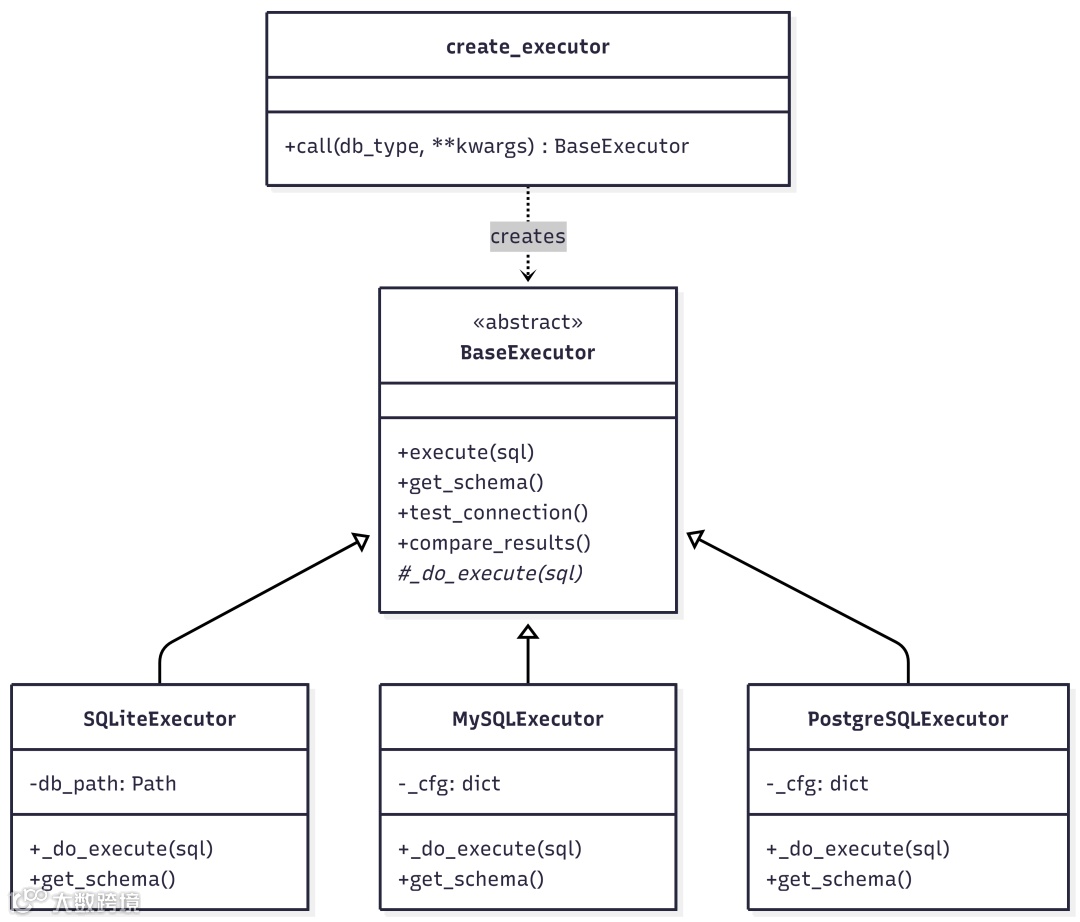 系统通过抽象基类 + 工厂模式,统一支持多种主流数据库: