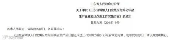 山东省人民政府办公厅印发《山东省城镇人口密集区危险化学品生产企业搬迁改造工作实施方案》,到2025年,城镇人口密集区现有不符合安全和卫生防护距离要求的危险化学品生产企业就地改造达标、搬迁进入规范化工园区或关闭退出(以下统称搬迁改造)。其中,中小型企业和存在重大风险隐患的大型企业2018年年底前全部启动搬迁改造,2020年年底前完成;其他大型企业和特大型企业2020年年底前全部启动搬迁改造,2025年年底前完成。