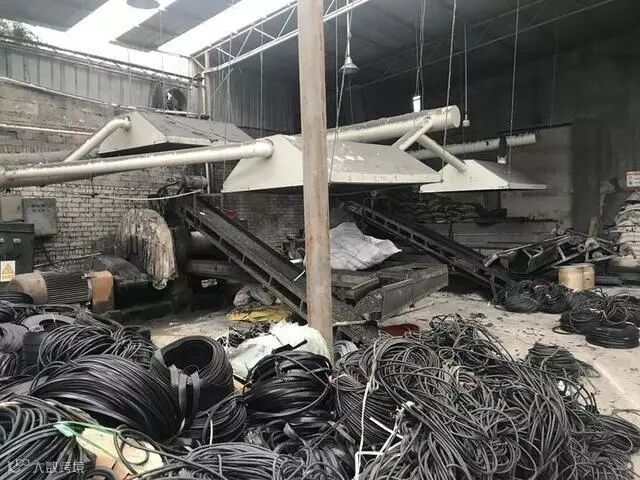大量废旧橡胶制品堆放在企业里面。