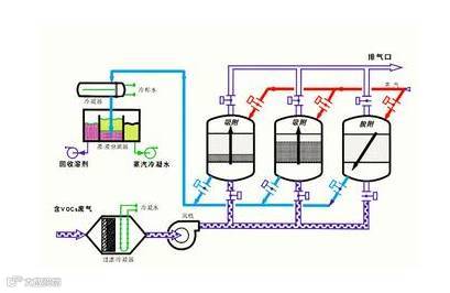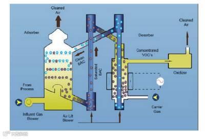 利用吸附剂(粒状活性炭和活性炭纤维)的多孔结构,将废气中的VOC捕获。将含VOC的有机废气通过活性炭床,其中的VOC被吸附剂吸附,废气得到净化,而排入大气。