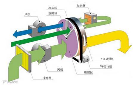 该系统采用蜂窝轮,连续不断地将低浓度、大风量的排气中的有机溶剂吸附、分离;然后,再用小风量的热风脱附得到高浓度、小风量的含有机溶剂气体。浓缩后的气体再与小型的催化燃烧或活性炭回收装置组合,构成经济的处理系统。