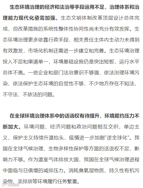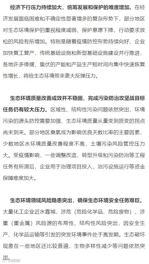 在看到成绩的同时,也必须清醒认识到,我国生态环境保护结构性、根源性、趋势性压力总体上尚未根本缓解,最突出的是“三个没有根本改变”,即以重化工为主的产业结构、以煤为主的能源结构、以公路货运为主的运输结构没有根本改变,环境污染和生态保护的严峻形势没有根本改变,生态环境事件多发频发的高风险态势没有根本改变。尤其是当前受新冠肺炎疫情影响,经济社会发展面临的不确定性因素明显增多,打赢污染防治攻坚战面临一些困难和问题。