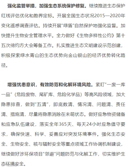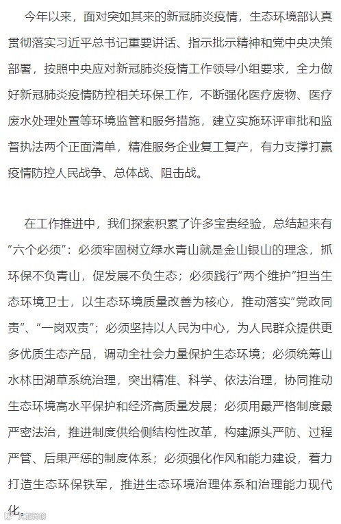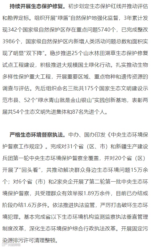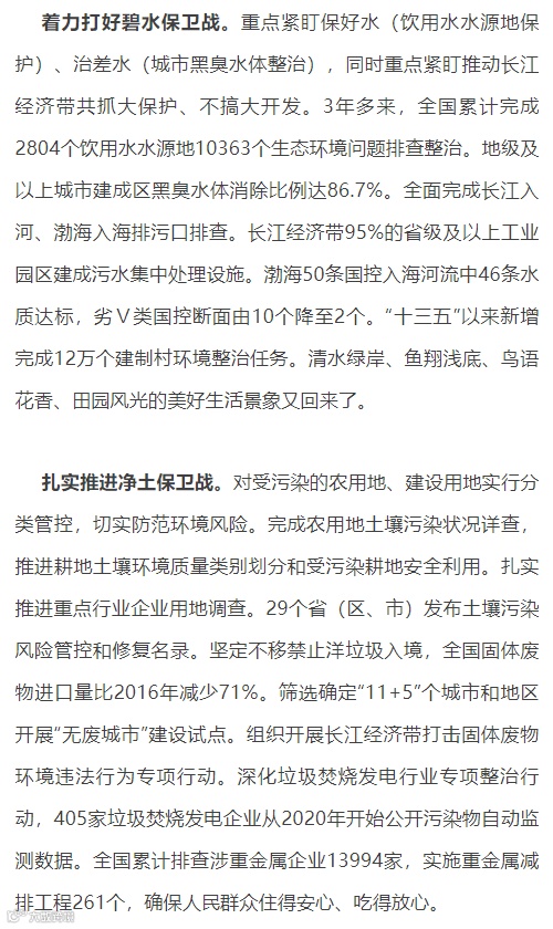 党的十九大以来,各地区各部门深入贯彻习近平生态文明思想和全国生态环境保护大会精神,聚焦打赢蓝天保卫战等七大标志性战役,全力以赴推进各项工作,推动污染防治攻坚战取得重要进展,生态环境质量明显改善。与2015年相比,2019年全国地表水优良水质断面比例上升8.9个百分点,劣Ⅴ类断面比例下降6.3个百分点;细颗粒物(PM2.5)未达标地级及以上城市年均浓度下降23.1%,全国337个地级及以上城市年均优良天数比例达到82%。“十三五”规划确定的生态环境保护9项约束性指标,其中有7项已提前完成2020年目标任务,为全面建成小康社会奠定了坚实基础。