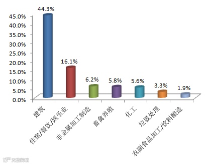 从行业类型来看,本月公众反映最集中的行业是建筑业,占44.3%,其次为住宿餐饮娱乐业和非金属加工业,分别占16.1 %和6.2%。