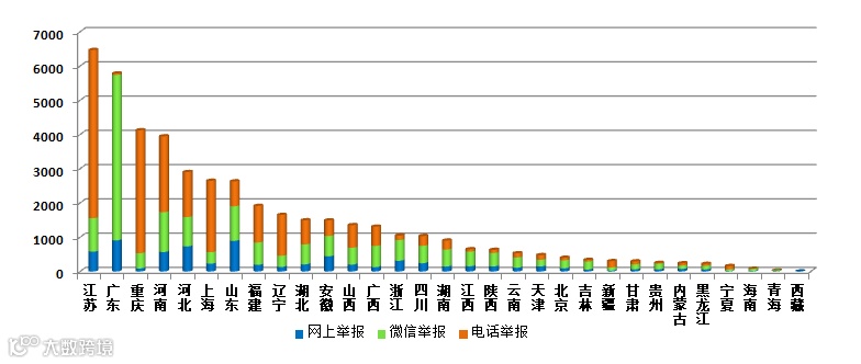 从各地区不同渠道举报数量看,江苏、重庆、河南、上海等地电话举报量较多,广东微信举报占比达83.5%。