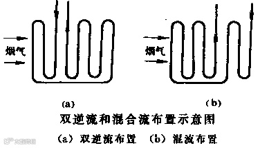 双逆流和混合流(见图)布置的换热器是综合吸取了逆流、顺流的优点,克服了它们缺点的一种换热器。既使冷、热流体间保持了较大的传热温差、较高的传热效率,又使冷、热流体的高温端错开,保证了换热器管壁的安全。