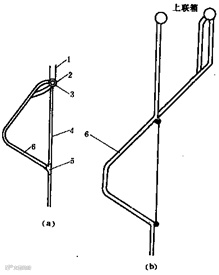 折焰角是由后墙水冷壁在一定的标高处,并按照一定的外形向炉膛内弯曲而成(俗称折焰鼻子),结构型式有两种,见附图所示。一种是借助分叉管,将每根水冷壁管分成两路,一路向内弯曲成一定形状。另一路为垂直短管,起悬吊传递水冷壁组件重量的作用。两路管内的汽水混合物均进入后水冷壁上联箱,再通过导管引入汽包。为了使大部分工质从受热强烈的折焰管通过,在垂直短管至联箱的连接处装有节流孔板,以限制垂直管的流通量。