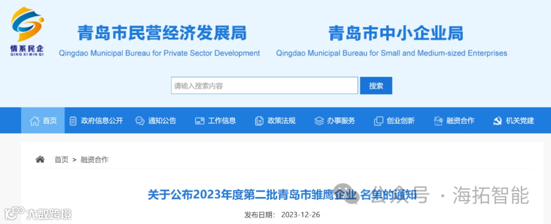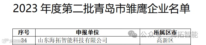 根据《青岛市雏鹰企业认定管理办法》和《青岛市民营经济发展局关于组织申报2023年度第二批青岛市雏鹰企业的通知》等文件精神,经企业自愿申报、区(市)民营经济(中小企业)主管部门审核推荐、专家评审和公示等,认定山东海拓智能科技有限公司为2023年度第二批青岛市雏鹰企业。