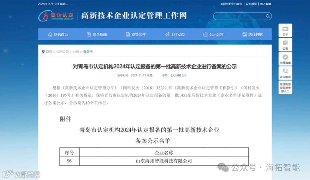 近日,根据《高新技术企业认定管理办法》(国科发火〔2016〕32号)和《高新技术企业认定管理工作指引》(国科发火〔2016〕195号)有关规定和审查,工信部火炬中心高新技术企业认定管理工作网发布了《对青岛市认定机构2024年认定报备的第一批高新技术企业进行备案的公示》,山东海拓智能科技有限公司顺利通过2024年度高新技术企业复审认定,再获“高新技术企业”荣誉称号。