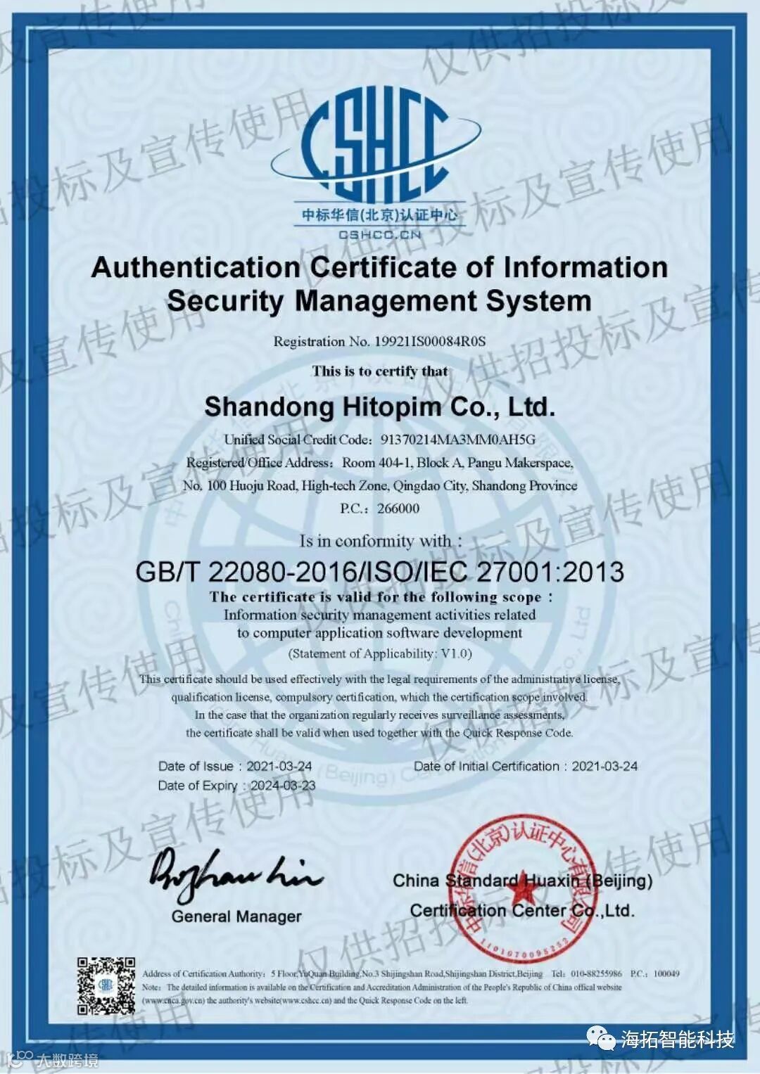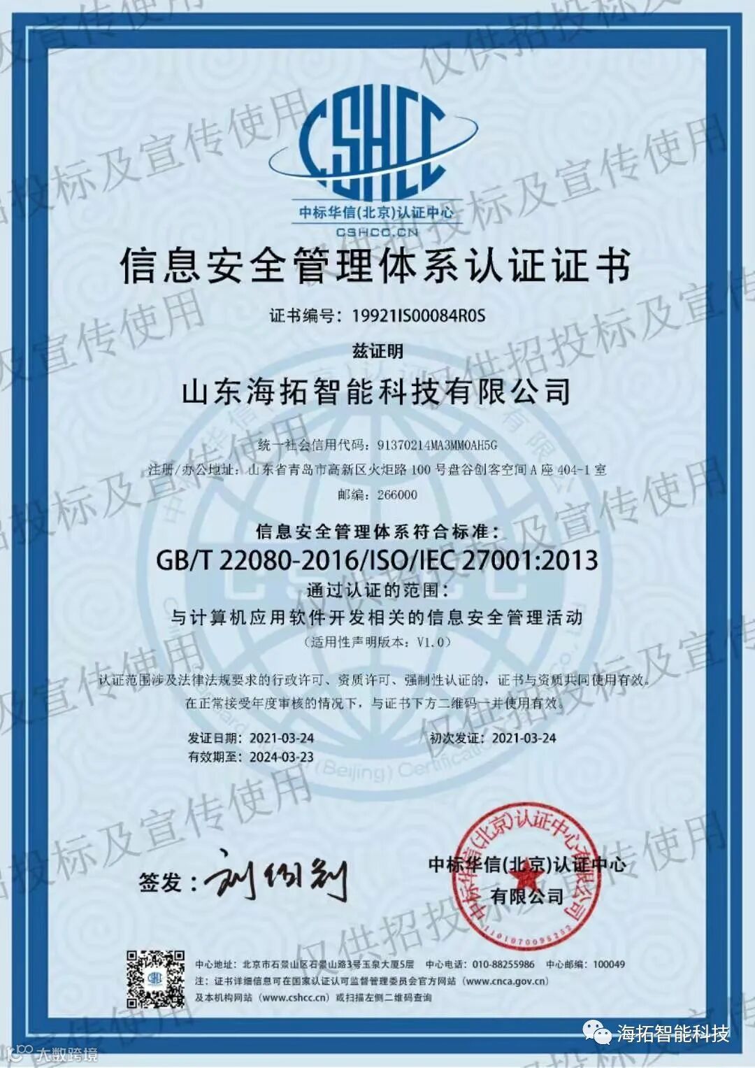 近日,经过中标华信的专家对海拓智能进行严格的考察评审,我司顺利通过ISO27001:2013认证审核,此次顺利通过ISO27001:2013认证,标志着我公司具备保护信息化进程健康、有序、可持续发展的能力,能做到信息安全控制方面的严谨性和有效性,从专业和权威层面为客户提供信息安全保障。