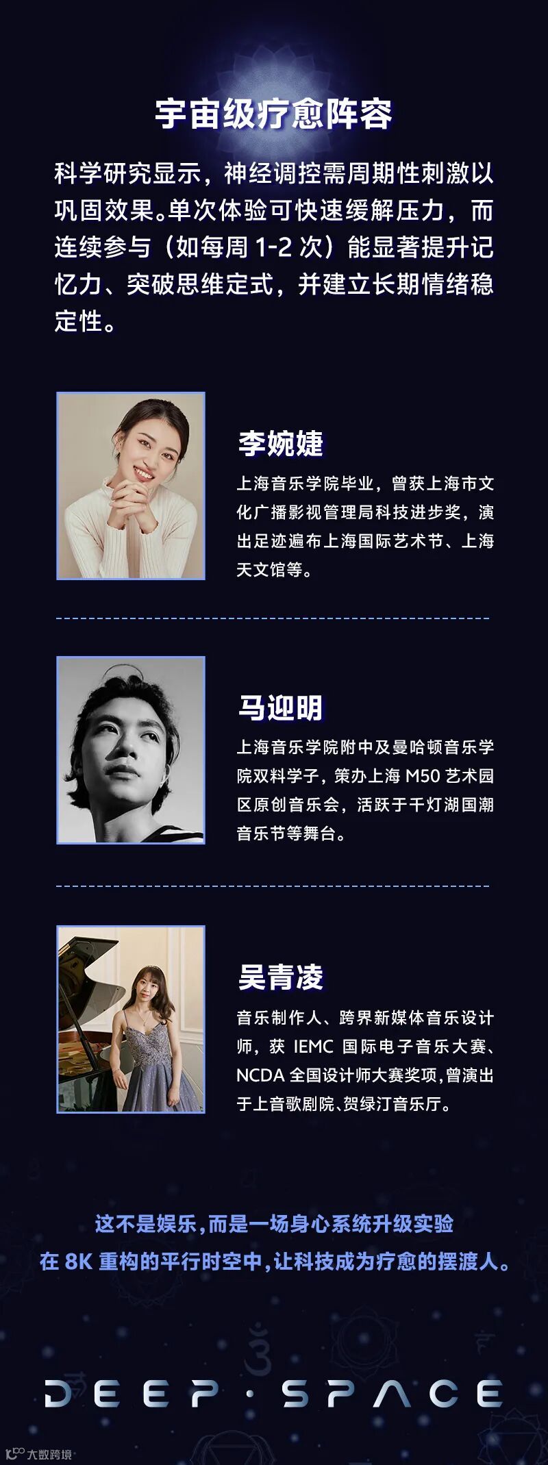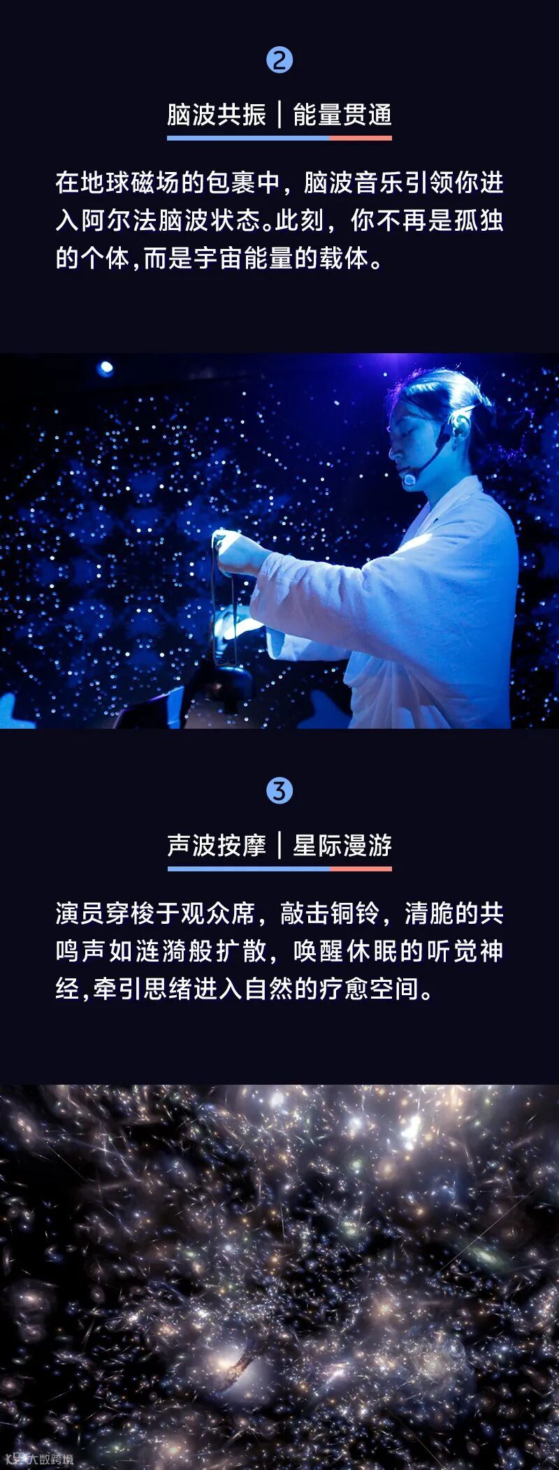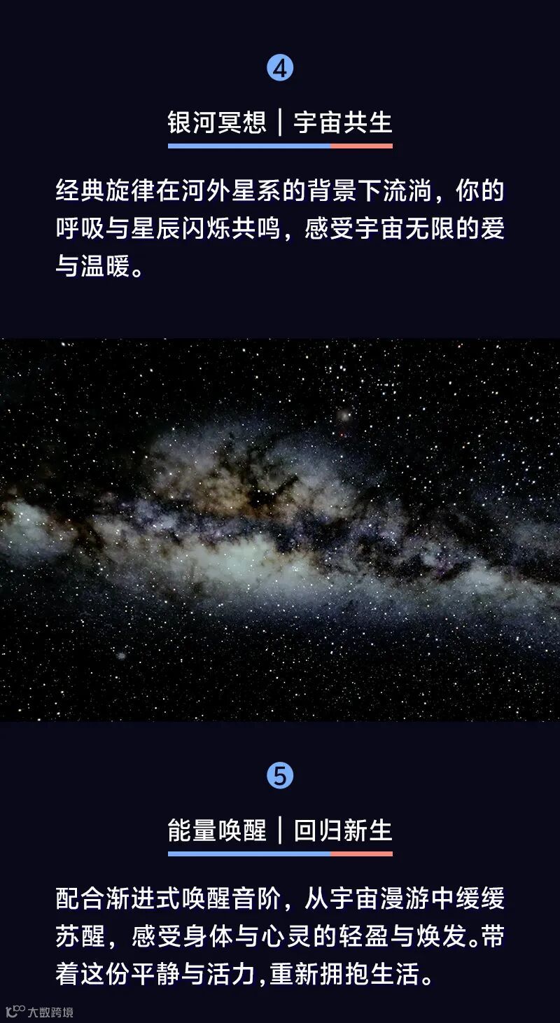 从地球极光到宇宙深空,从双耳脑波共振到声景冥想,60分钟的旅程将联动“听觉、视觉、触觉、嗅觉” ,用科学疗愈技术+自然乐器现场演奏,带你进入深度放松的「阿尔法脑波状态」 。在这里,呼吸与宇宙同频,思绪随星河流动,压力与疲惫被温柔瓦解。