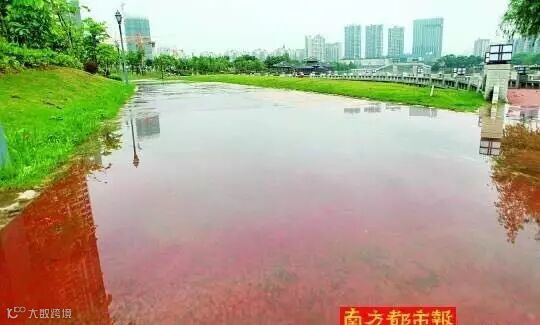 ▲昨日早上9时市金山湖公园南三环湖边。湖边散步的走廊已经被污水漫过。南都记者 田飞 实习生 林安迪 摄