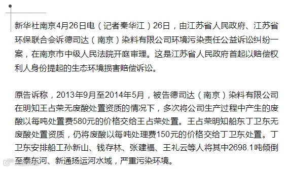 导读:江苏首例环境公益诉讼案开庭,危废处置不当导致河流污染,涉案企业同意赔偿生态修复费用近2500万