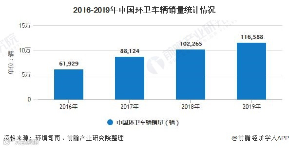 根据中国银行保险监督管理委员会的新车交强险统计数据,2019年全国环卫车辆销量116588辆,同比增长14.01%,近三年复合增长率