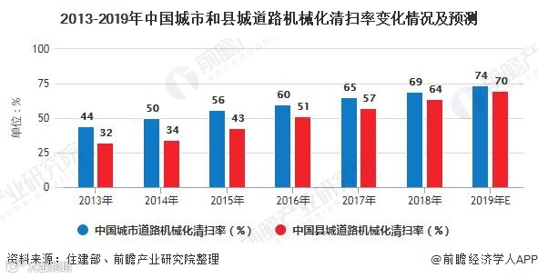 环保行业智慧化趋势明显。根据住建部《中国城乡建设统计年鉴》各年统计数据,我国城市和县城道路的机械化清扫率不断提升,2018年分别达到69%、64%,初步估计2019年达到74%和70%。