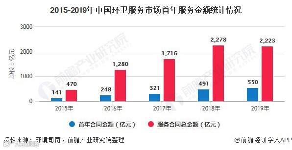 环卫服务市场化改革之初至目前成为必然的发展趋势,据环境司南不完全统计,2019年全国各地新签环卫服务合同总金额为2223亿元,同比略降2.41%,首年合同金额为550亿元,同比增长12.02%。